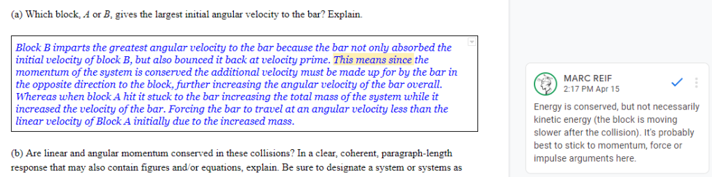 Below is a student’s modified answer to part (a) with my original comment. The blue check mark means that the comment was marked as resolved. The first attempt earned a grade of 60: